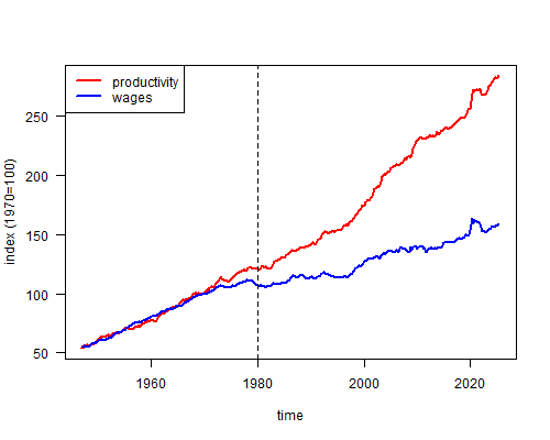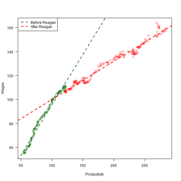 The graph plots an index of US real wages and an index of US productivity measured as GDP/hours worked. I used R to look at what happened to the relationship between real wages and productivity before and after the election of Ronald Reagan at the end of 1980. The FRED data is saved as fredgraph.xlsx.