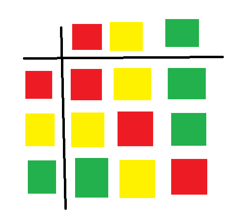 \[\begin{array}{c|ccc} & 0 & 1 & 2\\ \hline 0 & 0 & 2 & 1\\ 1 & 1 & 0 & 2\\ 2 & 2 & 1 & 0 \end{array}\]If $n=4$ then I think the answer is $10$. First, $P_e$ has to fix $e$. It can swap two of the other elements or fix them all. If it fixes them all, each of the other $P_x$ must swap $x$ and $e$ and can fix or swap the other two elements, so you can have three swappers, two swappers, one swapper, or no swappers among the $P_x$, which is four possibilities. Second, if $P_e$ swaps two elements, then the $P_x$ corresponding to the elements swapped by $P_e$ can either be swappers or not, giving three possibilities, and the remaining $P_x$ can be a swapper or not, for $3 \times 2 = 6$ possibilities. So in total there are $10$ possible cases.