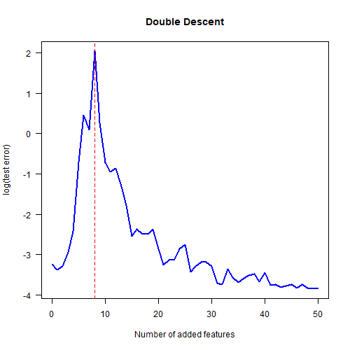 I couldn’t find an equally good post with R code, and there seems to be a lot of misinformation about double descent online, so I thought I would write my own post. Instead of porting the Shtoff example, I also decided to create something slightly simpler. How simple can a model be but still exhibit the double descent phenomenon? To answer that, I need to explain what double descent is.
