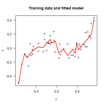 This shows the fit to the training data, but what we’re really interested in is the fit to unseen test data. We can use the following function to generate many test data sets and calculate the MSE of a pre-fitted model.