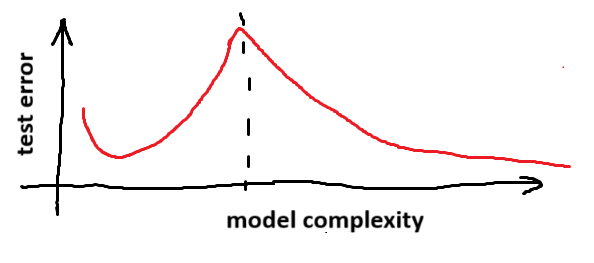 As neural networks became popular, people began to notice that there’s more to it than this. As you add more and more parameters to your neural network, you see the U-shaped curve. But beyond a certain point, the test error starts going down again.